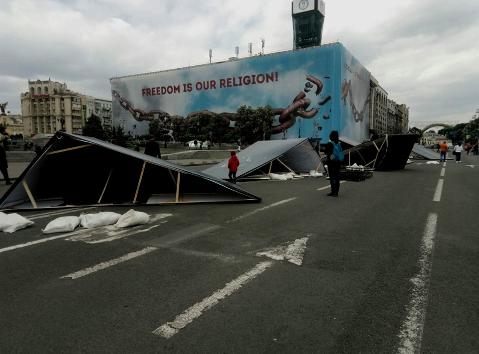 Знаки: В Киеве ветер уничтожил выставку, посвященную «героям АТО» (ФОТО)