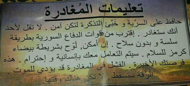 Оборотная сторона: Безопасный выход. Человек, несущий эту памятку, предоставляет её как обращение с просьбой об убежище силам обороны Сирии. Несущий эту памятку должен быть без оружия ради своей безопасности, с ним следует обращаться с уважением, предоставлять пищу, воду, медицинскую помощь по необходимости. Этот человек должен быть вывезен за пределы опасного района со всей возможной скоростью.