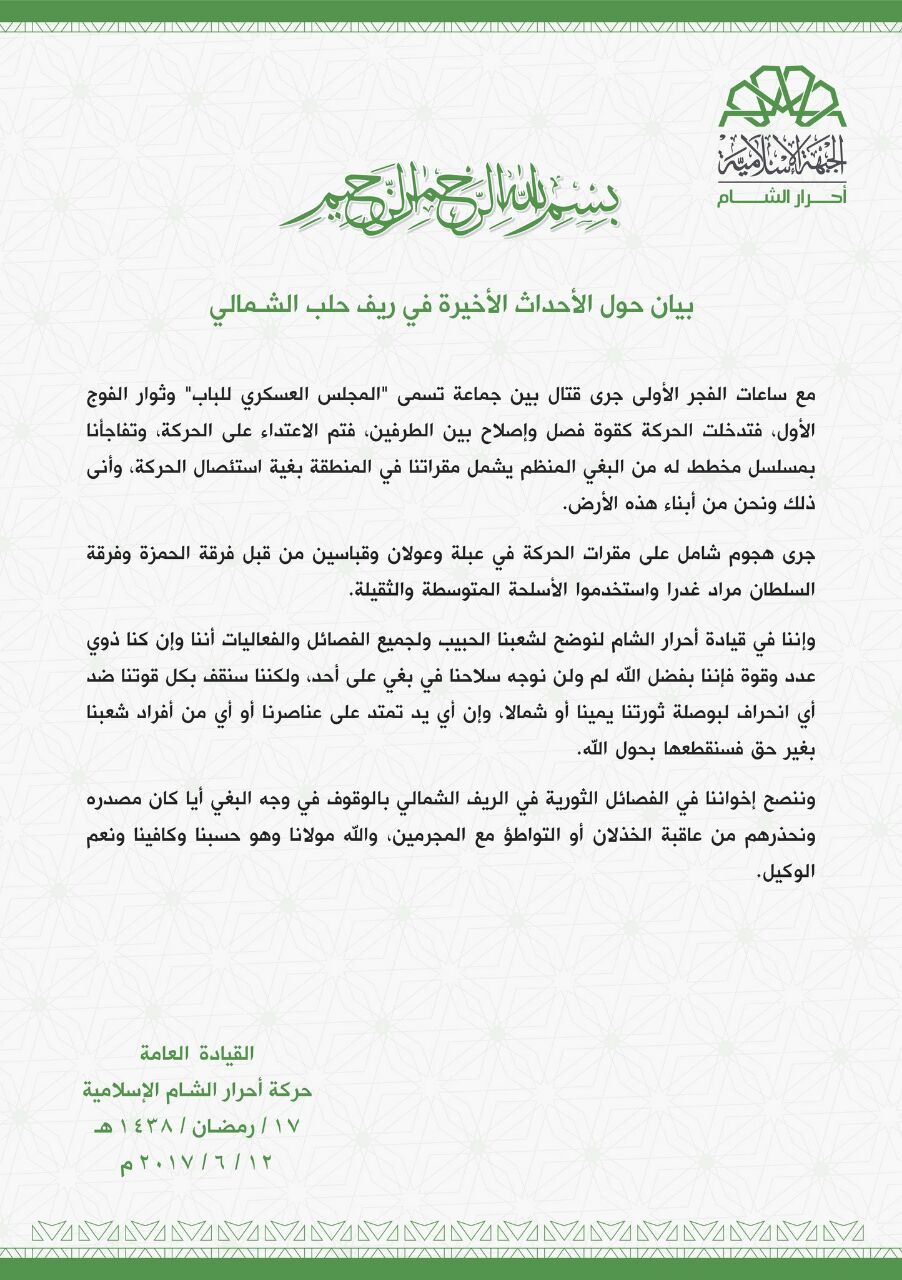 Главари «Ахрар аш-Шам» перебросили подкрепления своим союзникам, вступившим в противостояние с «Фирка Хамза». Полевой командир «Ахрар аш-Шам» сделал официальное заявление о готовности его группировки идти до конца против своих вчерашних союзников.
