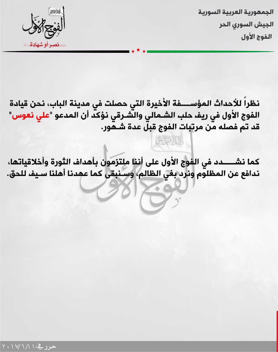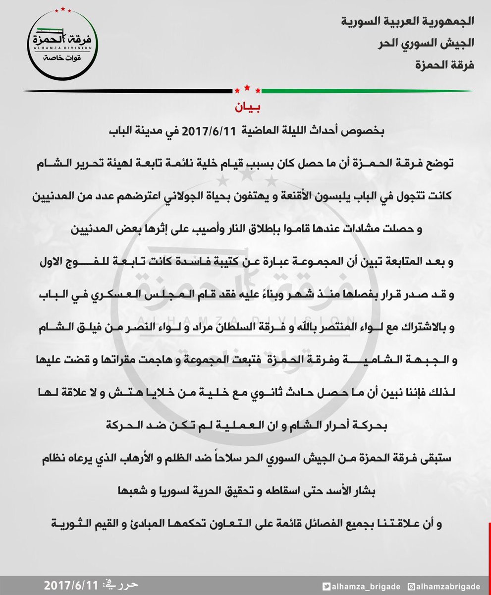 Так, «Фирка Хамза» пишет, что вопреки слухам «Фаудж Аууаль» связан не с «Ахрарами», а с «Аль-Каидой»* — «Хайят Тахрир аш-Шам», и вследствие действий этого бандформирования были жертвы не только среди «повстанцев», но и среди мирных жителей, причём виновата была приезжая бандгруппа, но «Первый полк» их поддержал. А на стороне Военсовета Аль-Баба вместе с «Фирка Хамза» действовали «Фирка Султан Мурад», «Лива Наср» из «Файлак аш-Шам», «Лива Мунтасыр Биллах» и «Джебхат Шамия» («Фронт Шама»).
