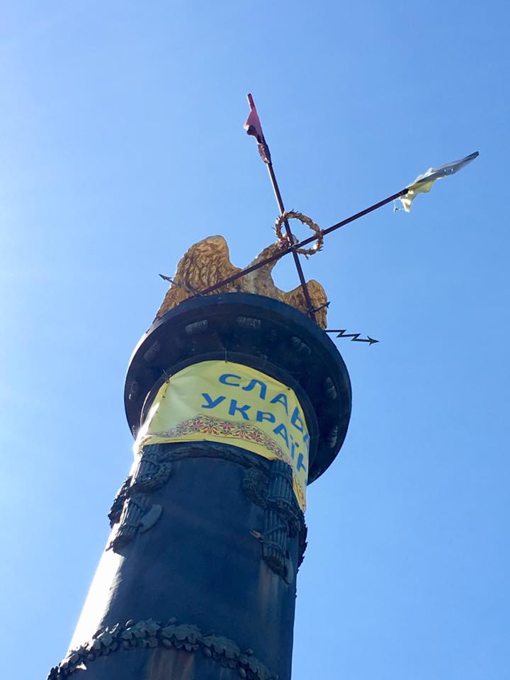 Как видно на снимках, на колонне разместили баннер с надписью «Слава Украине», а в лавровый венок на вершине колонны установили два флага на длинных древках — Украины и УПА*.