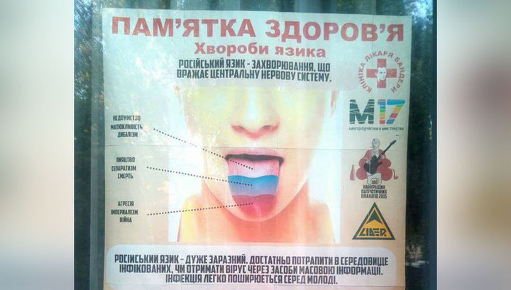 На улицах Киева появились плакаты с призывом отказаться от русского языка, который назван «очень заразным». Об этом сообщил ряд украинских СМИ, они и опубликовали фото с места событий.