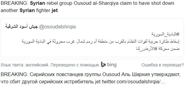 Во вторник проамериканские группировки «Осод Аль-Шаркия» и «Ахмад Абдо» заявили, что им якобы удалось сбить истребитель ВВС Сирии в регионе Бадия на юге САР. При этом никаких фотографий и видео обнародовано не было.