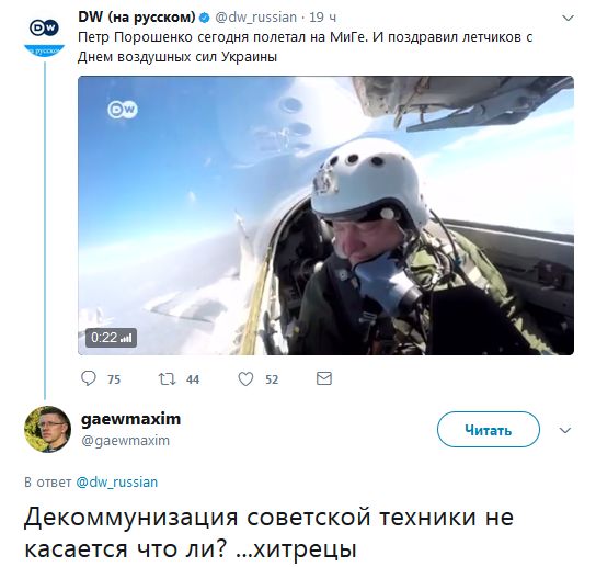 Перелет президента Украины Петра Порошенко из Киева в Винницу на «пассажирском» месте в Миг-29 вызвал саркастические комментарии даже в украинских социальных сетях. Пользователи интернета, помимо прочего, обратили внимание на гримасы главы Украины во время полета, на вторичность этого пропагандистского мероприятия, а равно и на пафосные заявления главы Украины после посадки.