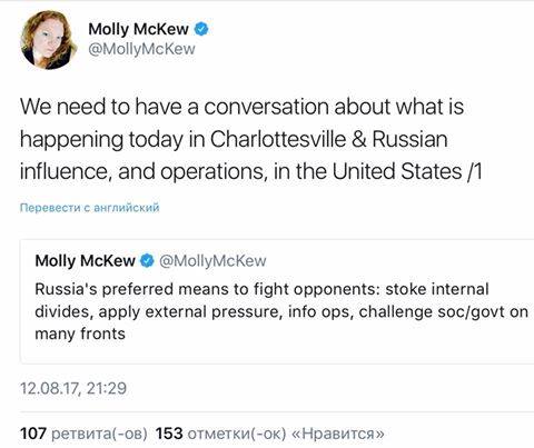 Она написала это в своём Twitter буквально сразу же после начала протестов. Маккью известна тем, что консультировала Михаила Саакашвили в 2008 году, а после — присутствовала в Молдавии во время протестов в Кишиневе, куда Молли прибыла из Одессы. Её спутник Влад Филат обвиняется в убийстве, которое якобы было совершено в июле 2015 г. в Одессе.