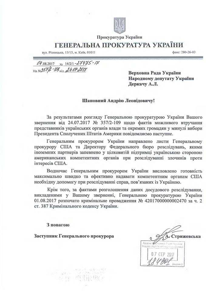 Об этом сообщает нардеп Андрей Деркач, публикуя официальный ответ Генпрокуратуры.