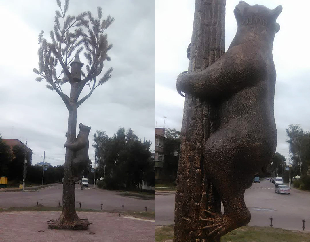 В поселке Сосница Черниговской области Украины установили шестиметровую скульптуру медведя на сосне, изготовленную по мотивам герба поселка.