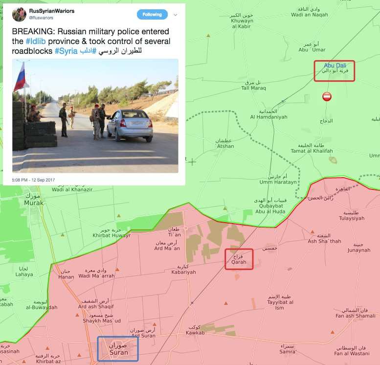 «Для контроля участка автодороги Хамиде — Абу-Духур — Суран российские военнослужащие подразделений военной полиции организовали и соответствующим образом оборудовали КПП в населенном пункте Крах. С этой же целью наблюдательный пункт был выставлен в районе населенного пункта Абу-Дали», — добавил собеседник РВ.