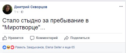 «Стало стыдно за пребывание в «Миротворце»…» — пишет на своей странице в Facebook блогер Дмитрий Скворцов, который уже давно присутствует на «Миротворце».