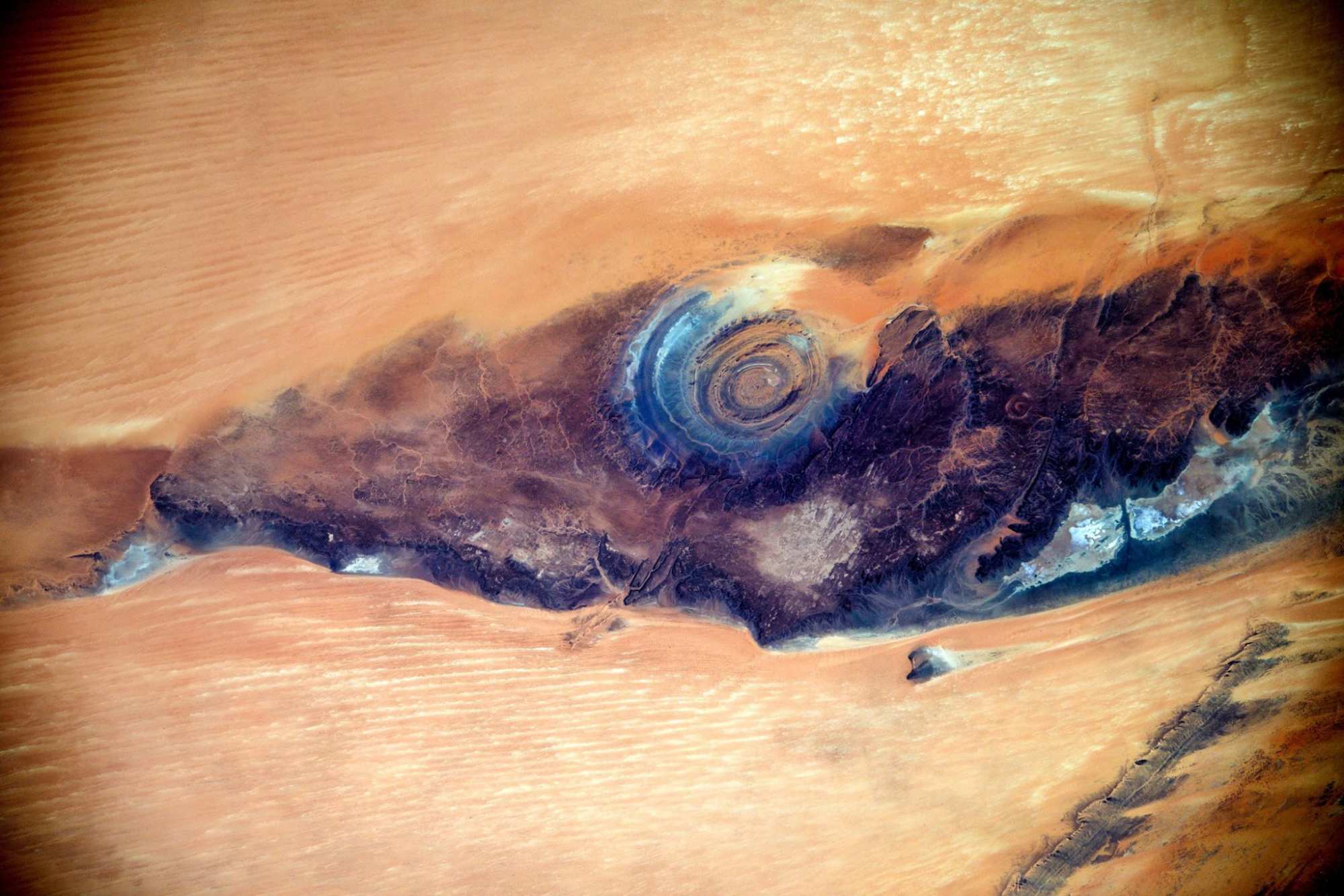 Российский космонавт Сергей Рязанский, находясь на борту Международной Космической Станции (МКС), сделал потрясающий снимок уникального геологического образования, расположенного в пустыне Сахара.