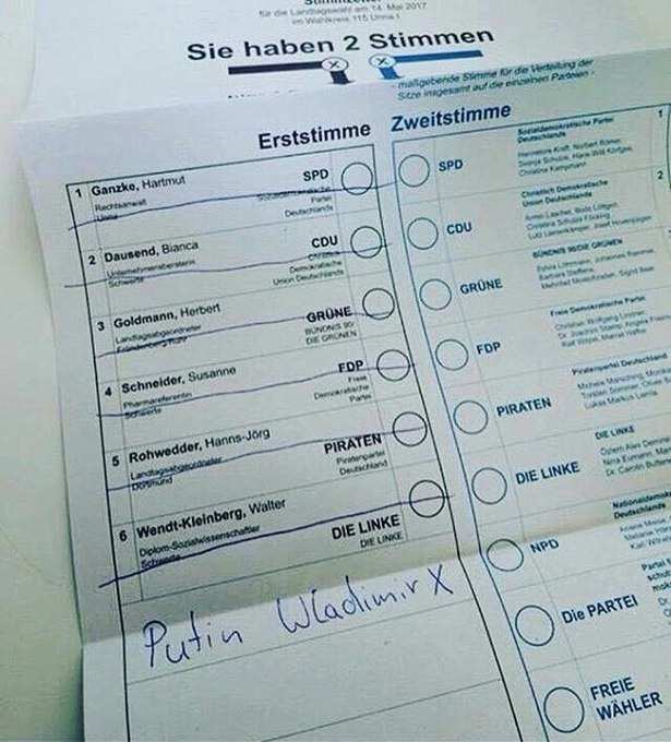 Кроме того, пользователи соцсетей публикуют фото бюллетеней, на которых немцы пишут имя Владимира Путина и ставят напротив него крестик. Судя по всему, таким образом граждане выражают свой протест против политики действующей власти.