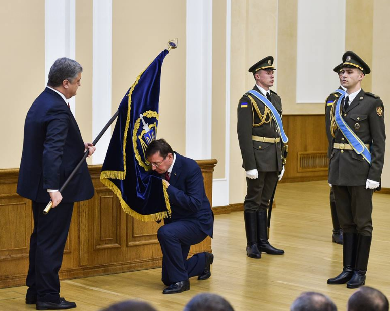 Снимок, на котором коленопреклоненный украинский генпрокурор Юрий Луценко принимает у Порошенко новый флаг и целует символику ГПУ, облетел СМИ, ну а пользователи социальных сетей уже создали множество мемов и т.н. фотожаб на тему.