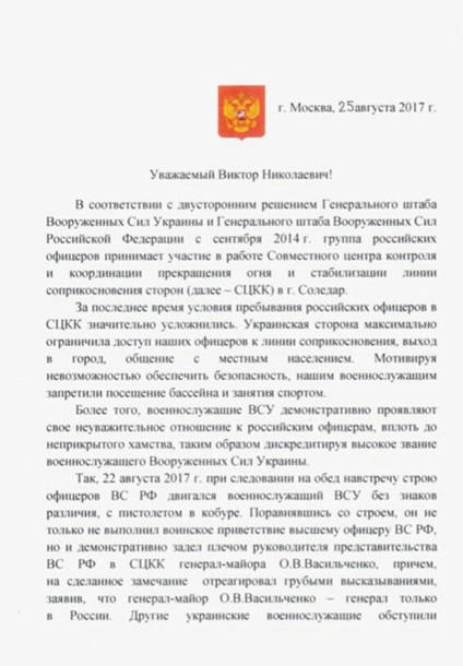 Однако цель данного «вброса» совершенно очевидна — дискредитация представительства Вооруженных сил Российской Федерации в СЦКК.