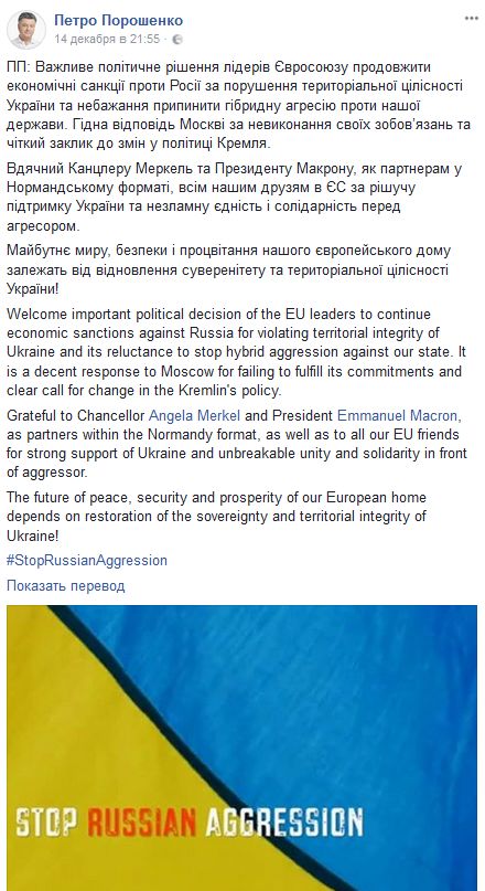«Важное политическое решение лидеров Евросоюза продлить экономические санкции против России за нарушение территориальной целостности Украины и нежелание прекратить гибридную агрессию против нашей страны. <…> Благодарен канцлеру Меркель и президенту Макрону, как партнёрам в нормандском формате, и всем нашим друзьям в ЕС за решительную поддержку Украины», — сообщил украинский президент на своей странице в Facebook.