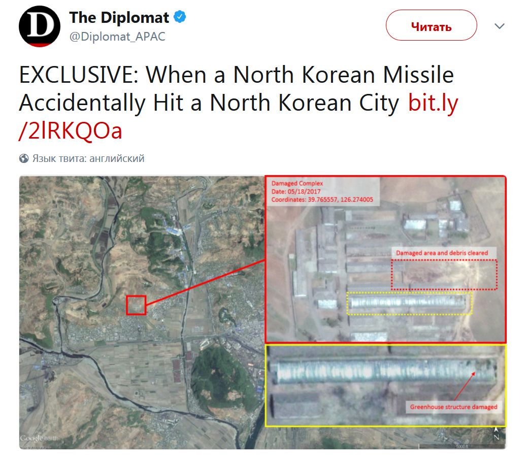 По данным издания, ракета среднего радиуса действия «Хвасон-12» упала на город Токчхон с населением в 237 тысяч человек, при этом был нанесен «серьезный ущерб» промышленным и сельскохозяйственным строениям. Источник отмечает, что ракета находилась в воздухе около минуты и преодолела не более 70 километров.