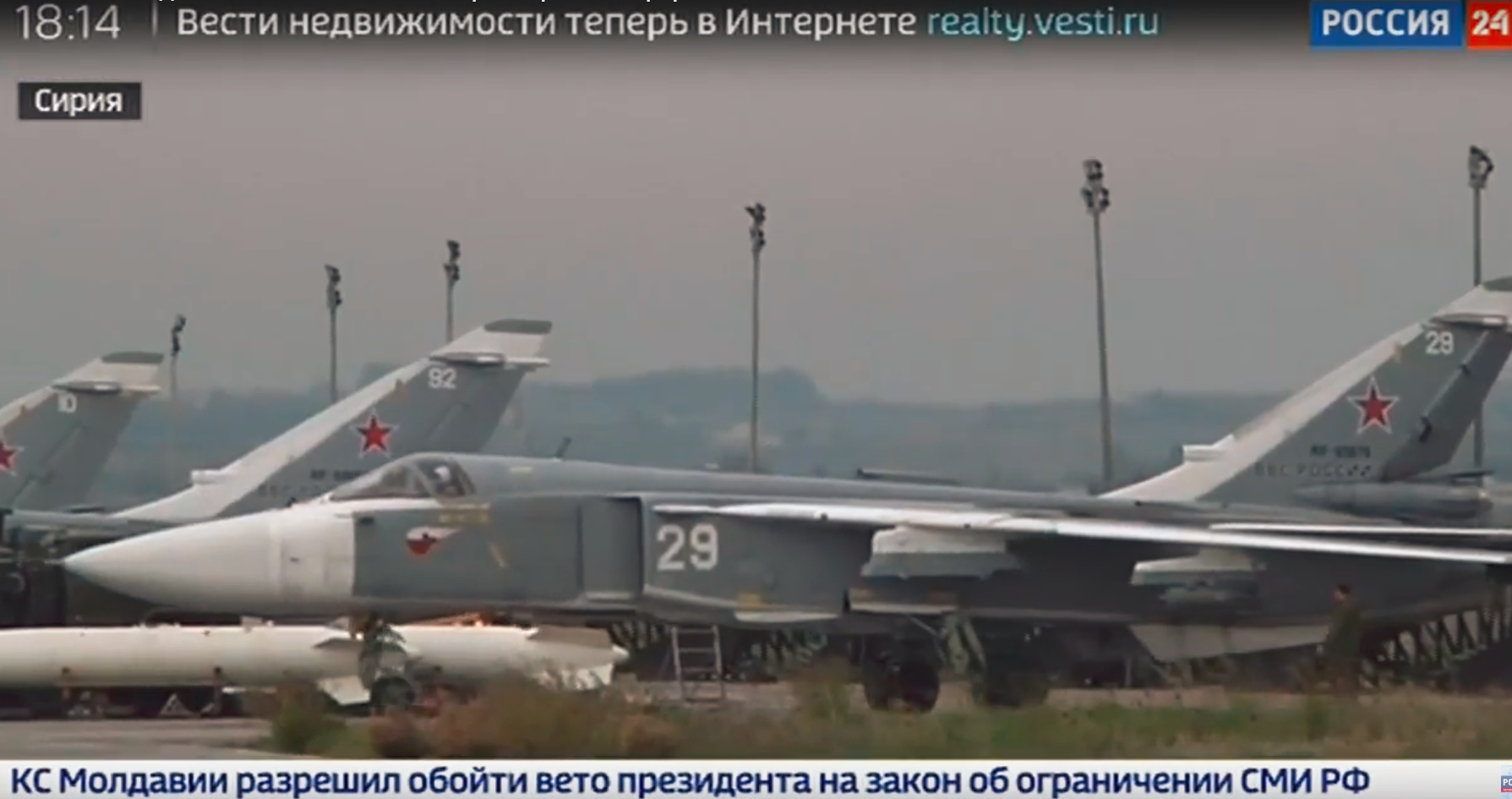 В объектив камеры оператора ВГТРК на авиабазе Хмеймим попала та самая «сушка» с бортовым номером 29. Самолет хорошо видно, он полностью цел и выруливает на «взлётку», а затем отправляется на боевое задание с «подарками» в места массового обитания «бармалеев».