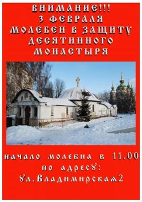 «Дорогие братия и сестры! 3 февраля 2018 года на 12:00 (13:00 мск — прим. РВ) под видом мирной акции архитекторов, раскольники и язычники при поддержке радикальных группировок, подстрекаемые отдельными народными депутатами (Рады), готовят силовой захват Десятинного монастыря Рождества Пресвятой Богородицы.