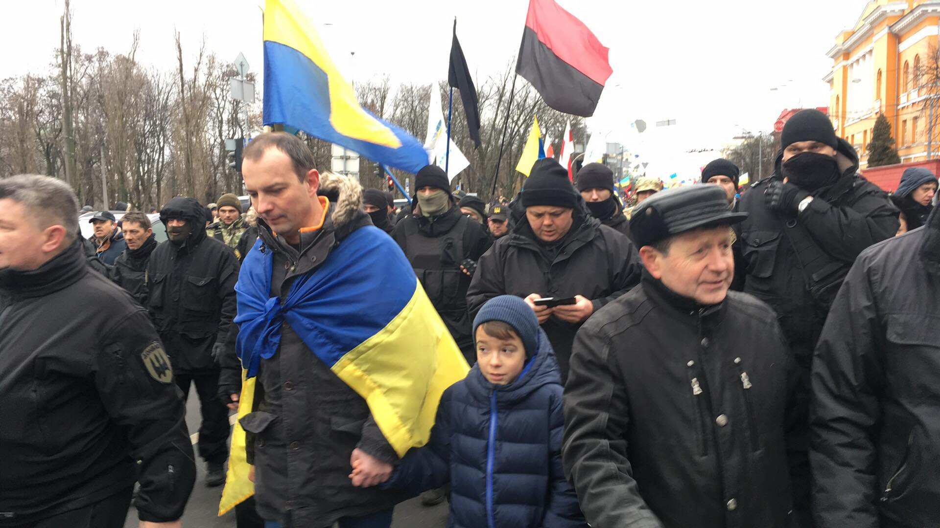 Из колонны марша слышны выкрики «Порошенко — х...» и призывы к президенту немедленно уйти с поста.