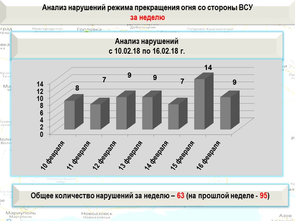 Всего за прошедшую неделю противник 63 раза нарушил режим прекращения огня и выпустил по территории Республики 132 мины калибром 120 мм и 309 мин калибром 82 мм.