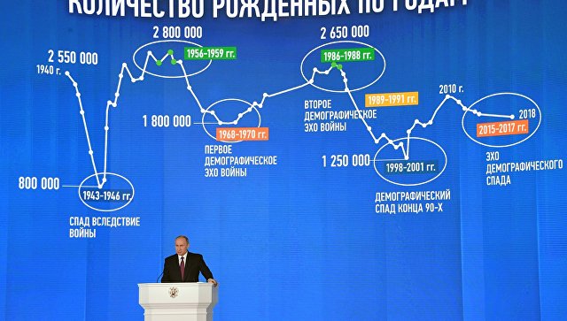 Демографические потери девяностых еще дают о себе знать, но ситуация переломилась, отметил глава государства.