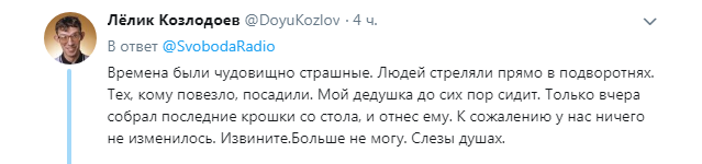 «Времена были чудовищно страшные. Людей стреляли прямо в подворотнях. Тех, кому повезло, посадили. Мой дедушка до сих пор сидит. Только вчера собрал последние крошки со стола и отнес ему. К сожалению, у нас ничего не изменилось. Извините. Больше не могу. Слезы душат», — прокомментировал Лёлик Козлодоев.