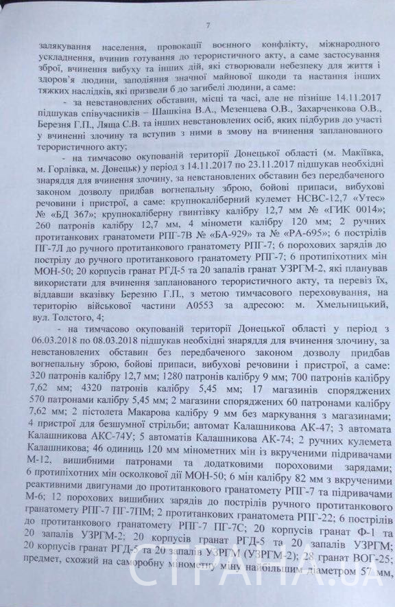 Украинское издание «Страна.уа» публикует текст подозрения Рубану, который оказался в распоряжении журналистов. Из документа следует, что переговорщику вменяют подготовку террористического акта и незаконное владение оружием.