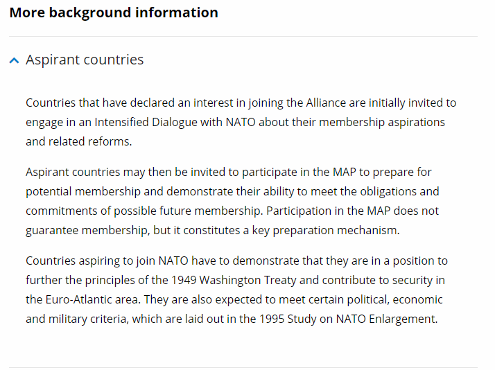 Отметим, что на официальном сайте альянса два дня назад в самом деле появилось небольшое примечание, посвящённое странам-аспирантам. В тексте примечания говорится, что «аспирантами» могут называться страны, которые стремятся стать членами альянса, что вовсе не гарантирует ответных действий со стороны НАТО.