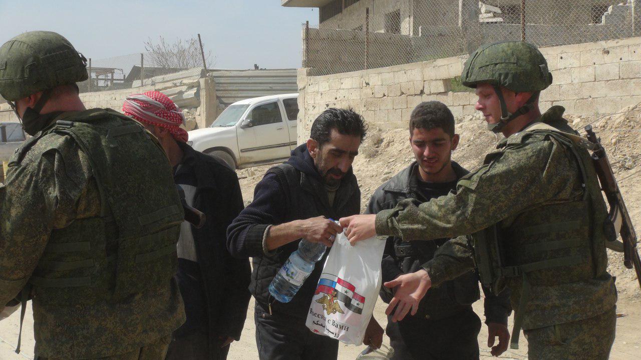 Военнослужащие военной полиции Минобороны РФ и офицеры Центра примирения враждующих сторон обеспечивают выход и раздают беженцам гуманитарную помощь — продуктовые наборы, воду и предметы первой необходимости.