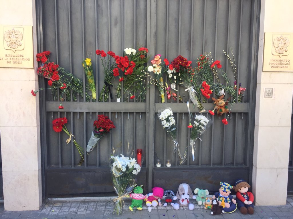 Жители Мадрида, Парижа, Лондона, Минска, Киева, Анкары, Тель-Авива, Астаны, Будапешта, Вены, Софии, Праги, Хельсинки, Еревана, Риги, Вильнюса, Таллина, Бишкека, Душанбе и многих других городов несут цветы и игрушки к зданиям российских дипломатических представительств.