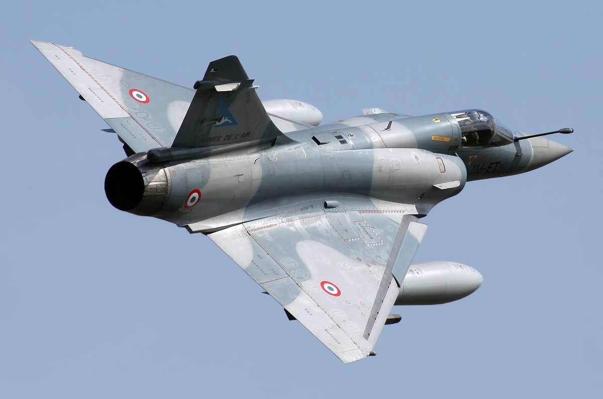 На кадрах несколько истребителей Мираж рулят по взлётной полосе, позже один из них идёт на взлёт.