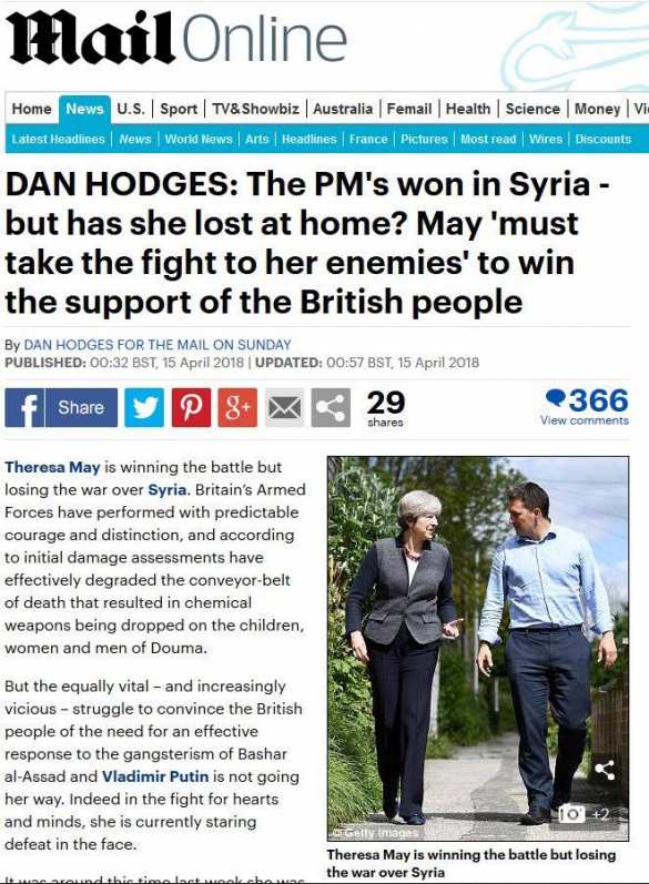 Вчера свои действия попыталась оправдать перед согражданами и премьер-министр Великобритании Тереза Мэй. Сперва она разместила в своём Twitter видеообращение, в котором объясняла, почему поступила именно так. Возможно, это стало реакцией на катастрофически просевший рейтинг после удара по Сирии — согласно опросу её действия поддерживает менее трети британцев, а британская пресса вчера вышла с заголовками вроде «Если Мэй что-то и выиграла в Сирии, любовь британцев она проиграла».