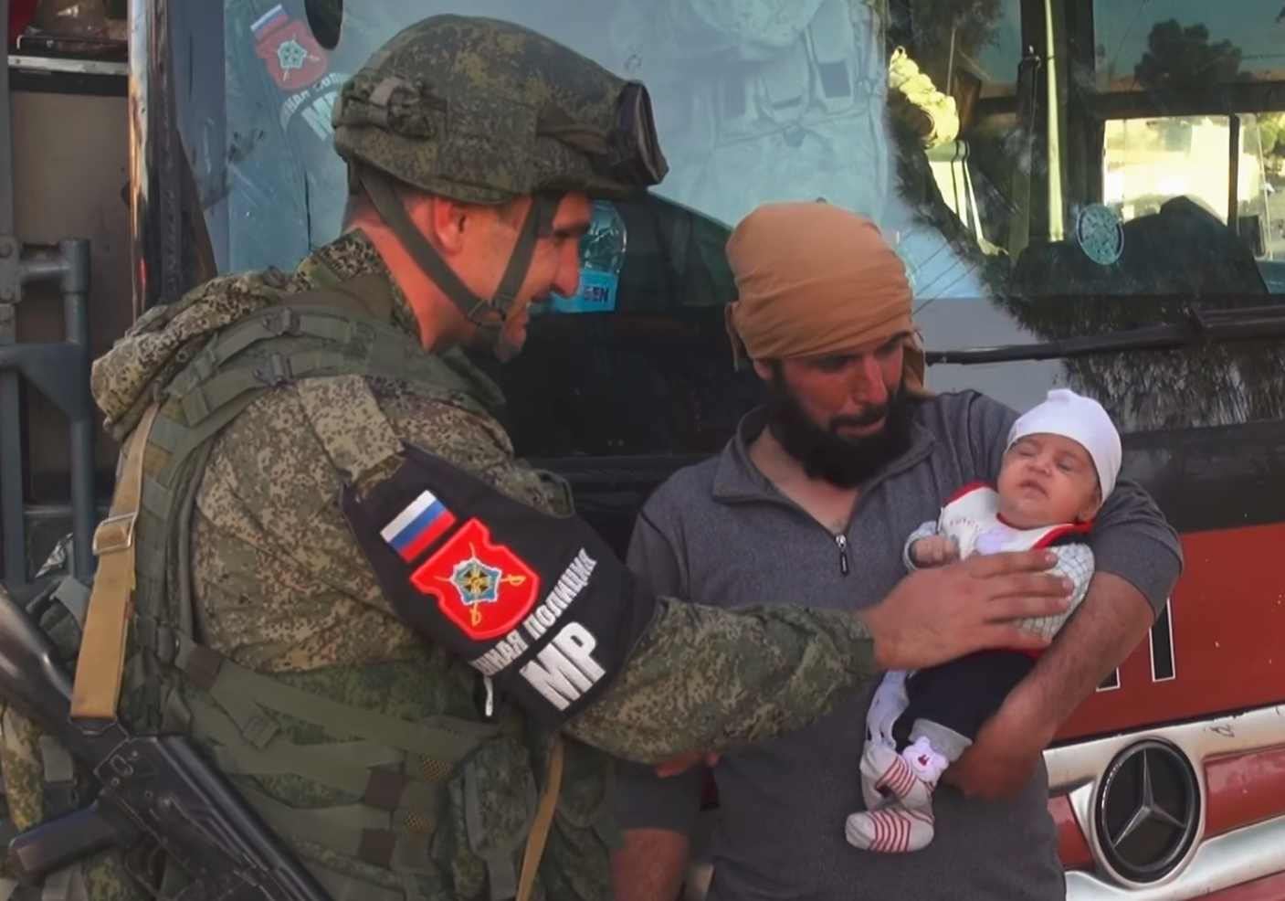 Предлагаем вашему вниманию уникальные кадры, на которых военнослужащие военной полиции Минобороны России играют с детьми боевиков во время вывода из населённого пункта Рухейба.