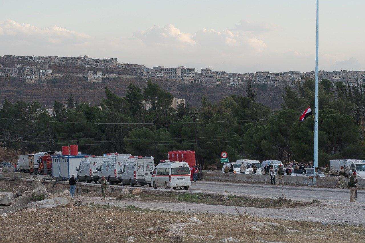Прямо на трассе Дамаск — Алеппо расположилось большое количество пассажирских автобусов, машин скорой помощи, пожарок, пикапов, легковушек. Это все растянулось на 2 км в длину. Духи бродят вдоль машин и автобусов, переносят свои пожитки, складывают их в автобусы и грузовики, иногда просто слоняются без дела. Работники красного полумесяца предпочитают оставаться возле своих машин и особо далеко от них не отходят.