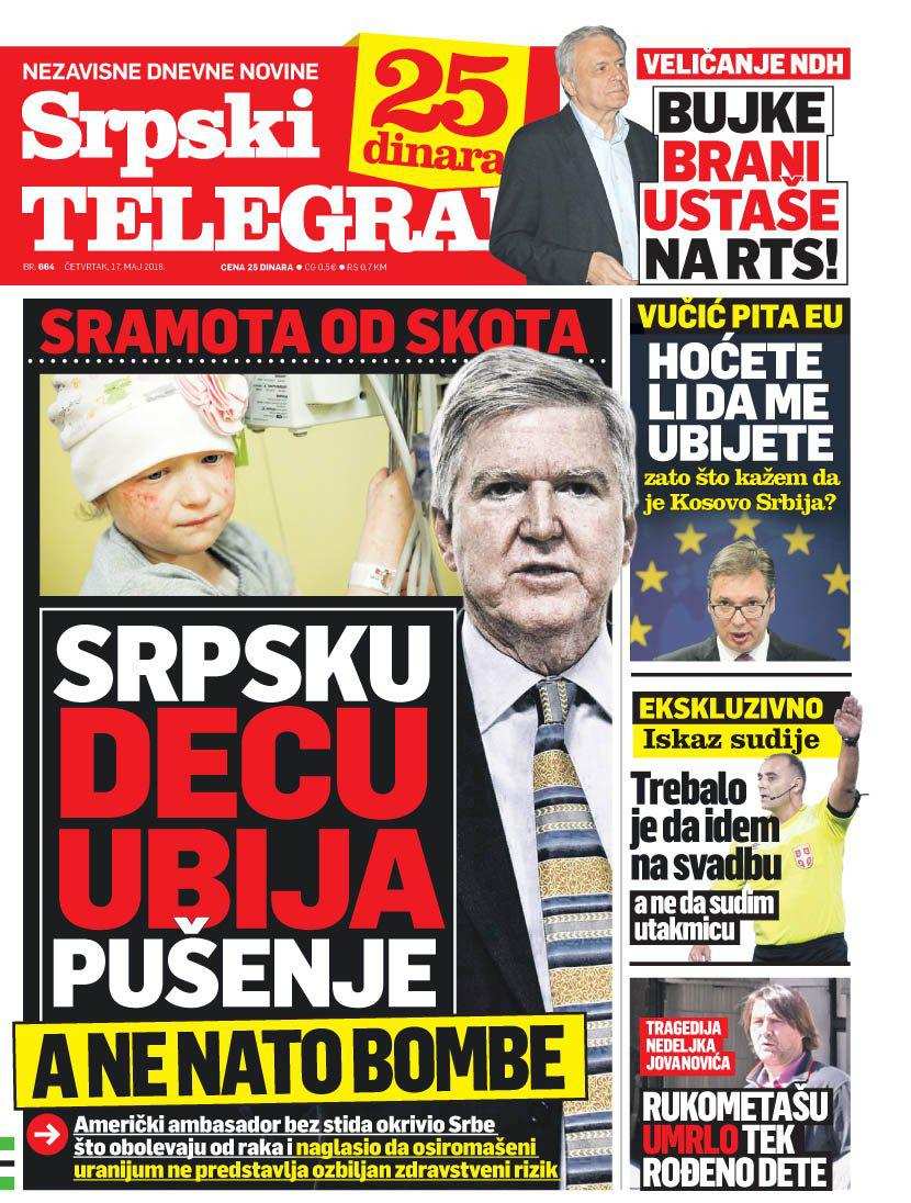 Сегодняшний номер сербского издания «Телеграф», близкого президенту Вучичу, выходит с грубым заголовком: Sramota od Skota — «Позор Скота — сербских детей убивает курение, а не бомбы НАТО — американский посол без стыда обвинил сербов, что они заболевают от канцерогенов, и подчеркнул, что обеднённый уран не представляет угрозы здоровью».