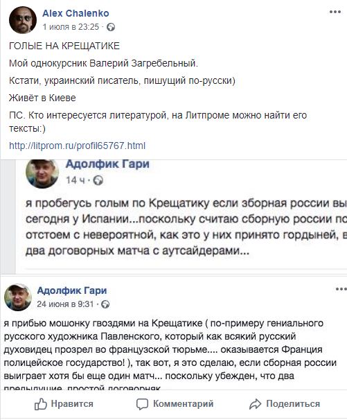 После поста о прибивании мошонки я написал другой пост, который злопыхатели потом распространили по ФБ. В нем, да, я написал о том, что пробегусь голым по Крещатику, если Россия выиграет у Испании.