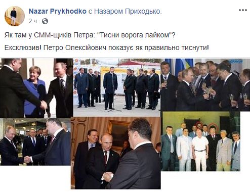 Журналист и блогер Назар Приходько опубликовал подборку фото с рукопожатиями Порошенко и Путина и подписал: «Эксклюзив! Петро Порошенко показывает, как правильно жать».