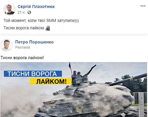 Пользователь Facebook Сергей Плахотнюк шутит: «Когда твои SMM* затупили — жми врага лайком».