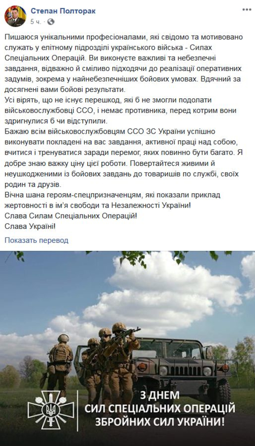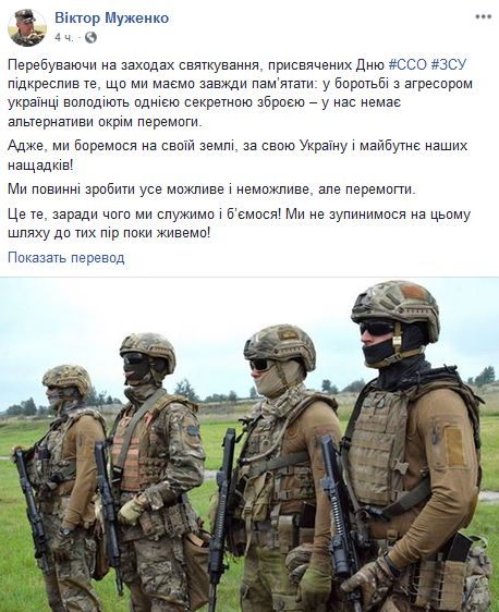 «О героизме и подвигах бойцов сил специальных операций сегодня не принято говорить вслух. Однако, я уверен, что придет время и Украина узнает своих героев! Как Командующий объединенных сил, знаю, что воины сил специальных операций всегда готовы смотреть в глаза врагу и целенаправленно добиваться своей цели», — заявил Наев.