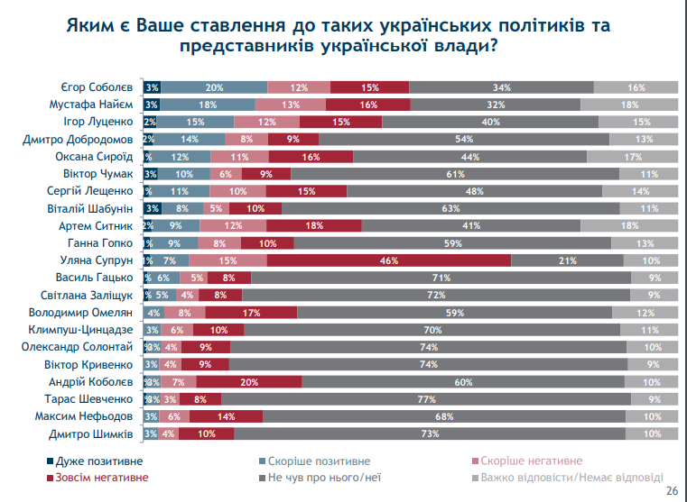 Второе место в этом списке занимает Андрей Коболев. Совсем негативное отношение ему выразили 20% респондентов. К Артему Сытнику совсем негативно относятся 18% опрошенных.
