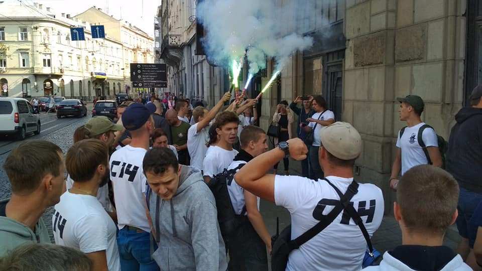 В первой половине дня 30 августа неонацисты из группировки С14 устроили «майдан» у здания суда во Львове, где должна была избираться мера пресечения их «побратиму» с позывным «Майор», подозреваемому в нападении на полицейского.