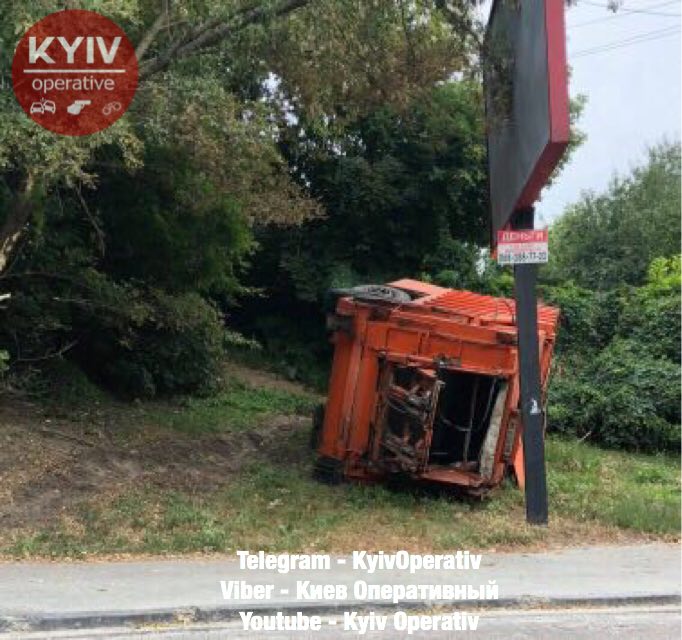 В воскресенье, 9 сентября, жители Киева весь день любовались лежащим на боку перевернувшимся мусоровозом. При этом муниципальные службы нисколько не торопились убрать машину.