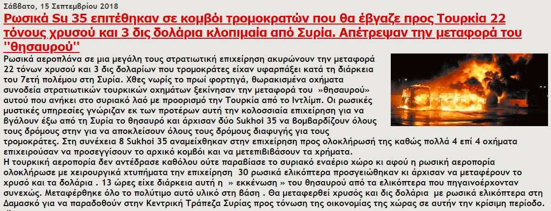 Интересную информацию сообщают греки (греческие СМИ. — прим. РВ) — на днях в Идлибе российские военнослужащие провели операцию по изъятию у боевиков 22 тонн золота и $3 млрд.
