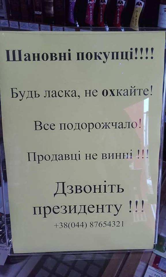 «Уважаемые покупатели! Пожалуйста, не охкайте! Все подорожало! Продавцы не виноваты! Звоните президенту!» — сказано в объявлении.