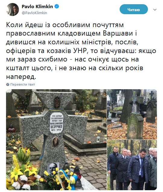 Вчера, 23 октября, министр иностранных дел Украины Павел Климкин прибыл с визитом в Польшу. Он посетил варшавское кладбище и возложил цветы к могилам офицеров и казаков армии УНР.
