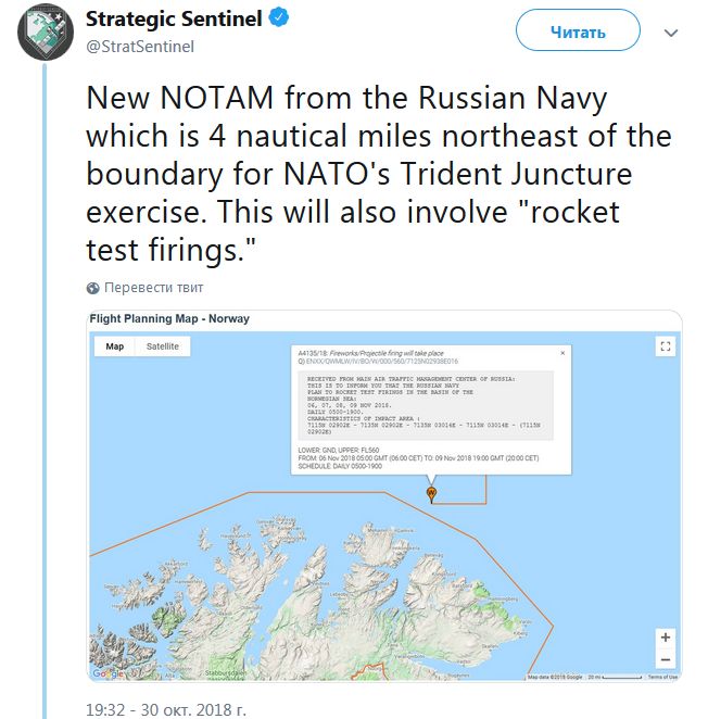 Кроме того, Москва предупредила NOTAM (англ. NOtice To AirMen — оперативно распространяемая информация об изменениях в правилах проведения и обеспечения полетов и аэронавигационной информации. — Прим. ред.) о предстоящих полетах с первого по третье ноября над Норвежским морем. Это сообщение также встревожило НАТО, сообщает RT.