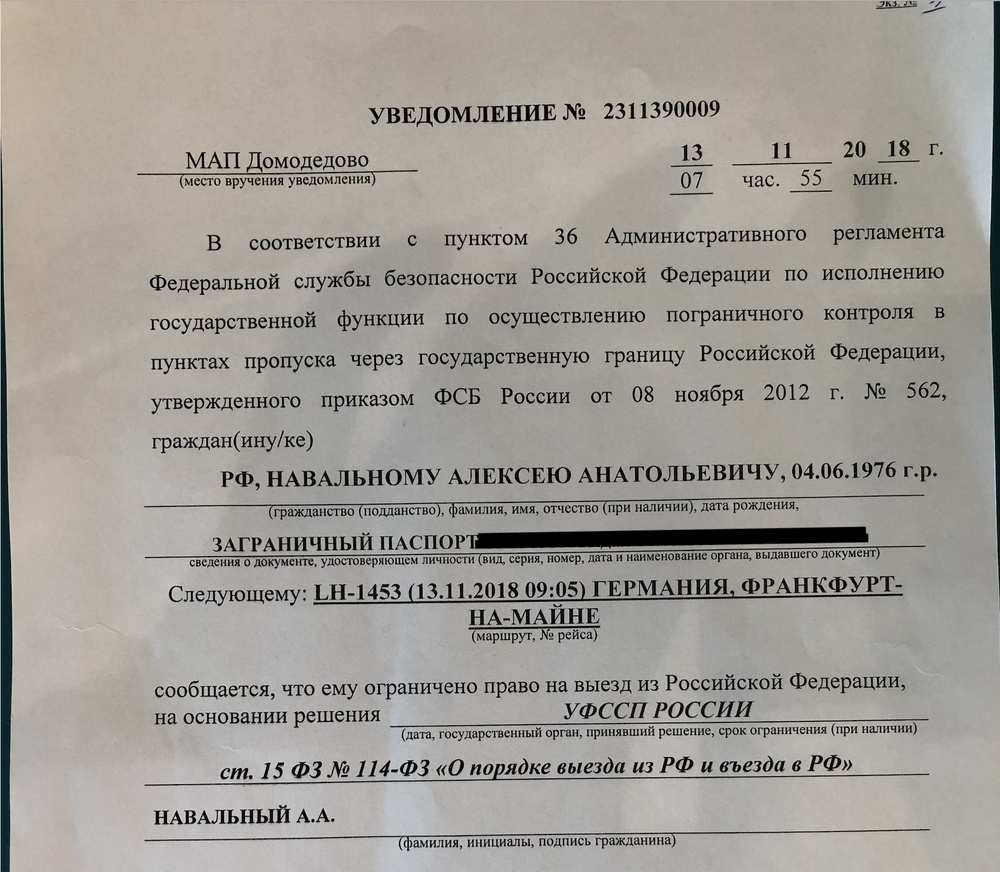 В копии уведомления, позже опубликованной Навальным на его сайте, отмечается, что выезд за границу ему ограничен федеральной службой судебных приставов в соответствии с ст. 15 закона «О порядке выезда из РФ и въезда в РФ».
