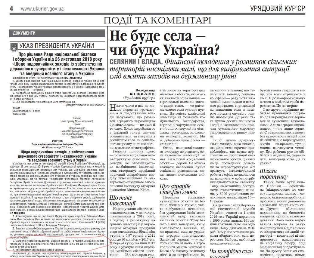 В официальной газете украинского правительства «Урядовий кур'єр» опубликовали указ президента Порошенко о введении военного положения на 60 суток — до 25 января 2019 года — и на всей территории страны, а не в отдельных областях.