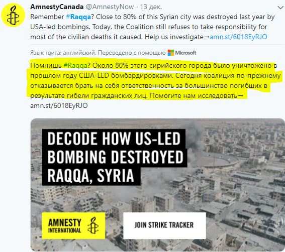 Однако тотальное уничтожение города бесчисленным множеством ударов ВВС коалиции и гибель как минимум 10 000 мирных жителей с большим трудом можно назвать освобождением. До сих пор тысячи погибших жителей Ракки находятся под завалами разрушенных американцами и их союзниками домов города.