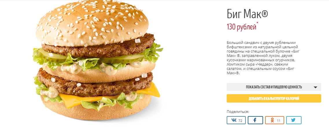 Данные The Economist о стоимости Биг Мака в России отличаются от официальной цены, указанной на сайте McDonald's (130 руб.).