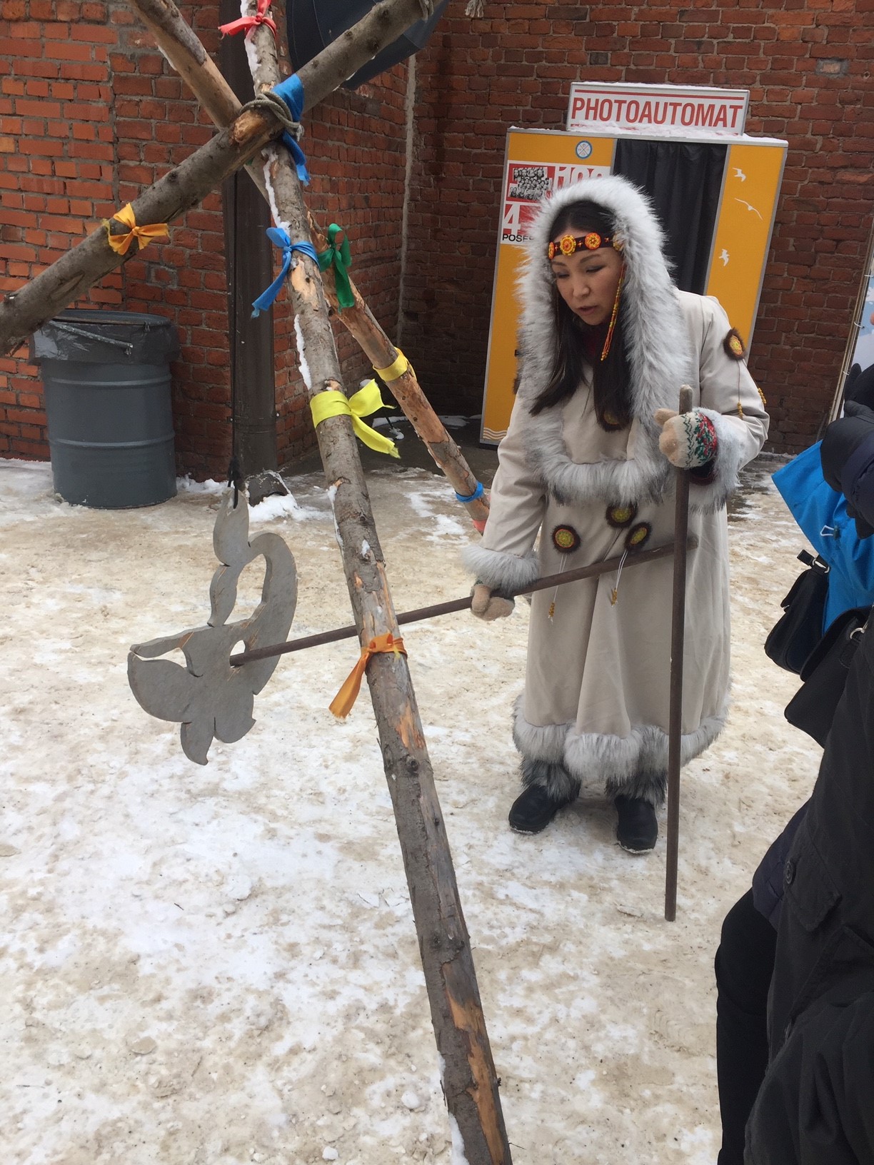 Случайному прохожему, который в это время пересекает площадь, кажется странным, что с ее правой стороны почему-то установлено несколько яранг, большой «платяной» белый прямоугольный «шатер», небольшой ларек, в котором торгуют гамбургерами с олениной — гамбургеры угольного цвета, и еще несколько объектов поменьше.